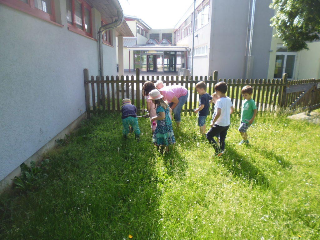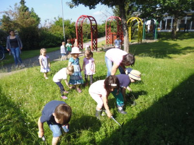 Im Rahmen des Themas unserer Waldfüchse( Gruppe von 26 Kindern, die einmal pro Woche einen Waldtag haben) interessierten sich alle Regenbogenkinder über Arten und Lebensweisen der Bienen. Wir beschlossen, mit allen Kindern dieses interessante Thema durchzuführen. Während der Recherche zum Thema stießen wir auf ihren Wettbewerb und beschlossen unser Glück zu versuchen:)In verschiedenen Beschäftigungen, Gesprächen, Bilderbücher, Sachbücher, Bastelarbeiten..........brachten wir den Kindern bei, wie wichtig Bienen für unsere Blumen, Pflanzen und Ernährung sind. Wir beschlossen in unserm Garten eine "Bienenfreundliche Zone" einzurichten. Dazu ließen wir ein Stück unseres Rasens im Vorgarten des Kindergartens nicht abmähen und säten verschiedene Samenmischungen ein ( Insektennachtisch, Bienenbuffet, Honig-Macher) ein. An den Pflanzsteinen unseres Regenbogenweges, der zum Kindergarten führt, pflanzten wir bienenfreundliche Blumen ein.