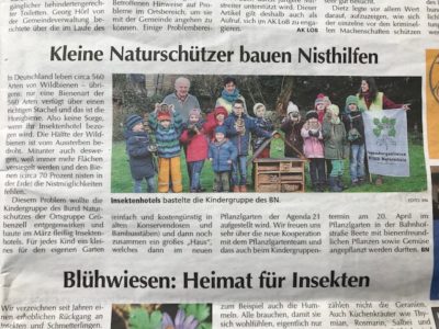 Unsere Kindergruppe besteht seit Sept. 2017- mit der Bund Naturschutz Ortsgruppe Gröbenzell haben wir das Jahr der Biene ausgerufen und war in diesem Rahmen auch mit der Kindergruppe tätig. Neben dem Ansähen der Pflanzen haben wir auch ein Insektenhotel und für jedes Kind eine kleine Nisthilfe gebaut und waren bei einem lokalen Imker und haben ihm bei seiner Arbeit über die Schulter geschaut.