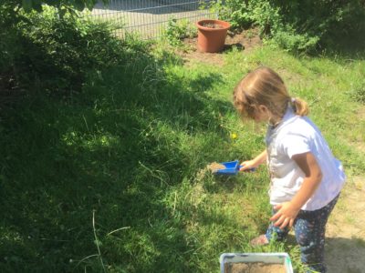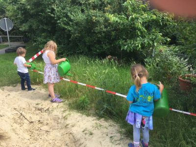 Wir fanden heraus, dass unser Außengelände zwar viel Grün hatte aber irgendetwas fehlte, weshalb es hier keine Insekten gab. Die Kinder unterhielten sich untereinander und sagten: „Wir müssen in den Generationengarten gehen, die wissen was uns fehlt.“
