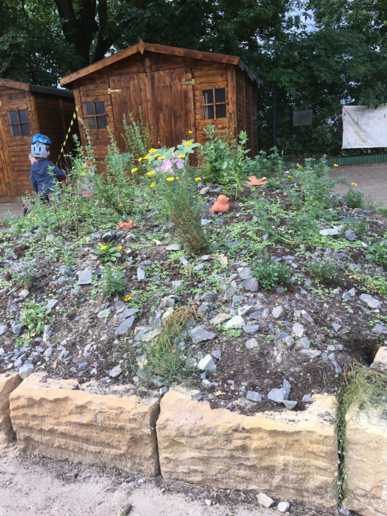 Gemeinsam mit der Landschaftsarchitektin Renate Froese-Genz und in Kooperation mit der Initiative "Grün macht Schule - Kindergarten" haben wir in den letzten vier Jahren mit unseren Kindern, Pädagog/innen, Eltern, der ev. Matthäusgemeinde als Trägerin im Rahmen von Elternnachmittagen, Elternabenden, Workshops, Befragungen , Abstimmungen und gemeinsamen Aktionen herausgearbeitet worauf es ankommt. Vögel sollen sich ansiedeln, Schmetterlinge und Bienen kommen, der Garten soll grün werden. Es soll ein Garten sein, in dem Kinder eigene Spuren hinterlassen können und erleben, wie etwas entsteht. Wo Kinder selbstwirksam werden und erfahren. Ich kann etwas bewirken!