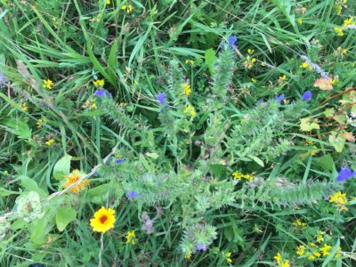 Wildblumen: Schafgarbe, Kornblume, Wiesen-Flockenblume, Gemeine Wegwarte, wilde Möhre, gewöhnlicher Natternkopf, Johanniskraut, Färberwaid, Acker-Witwenblume, Margerite, Moschus-Malve, wilde Malve, weißer Steinklee, gelber Steinklee, Klatschmohn, Spitzwegerich, Silber-Fingerkraut, Acker-Rettich, Färberwau, rote Lichtnelke, weiße Lichtnelke, Taubenkropf-Leimkraut, Acker-Senf, Rainfarn, großblütige Königskerze, schwarze Königskerze