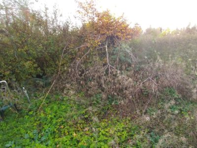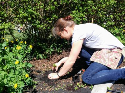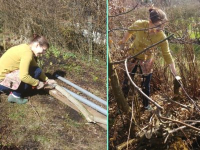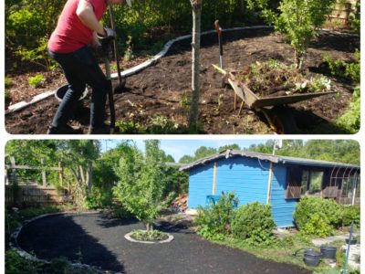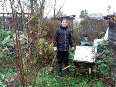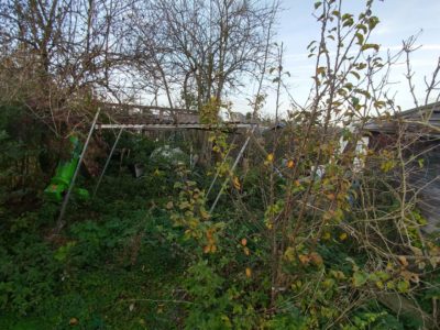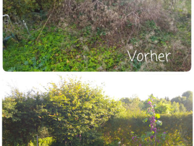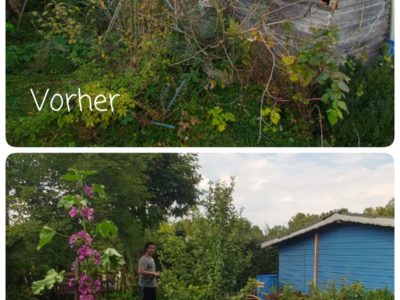 Wir haben im November 2017 eine verwilderte Kleingartenparzelle übernommen. Die Hütte steht mittig in dem länglichen Grundstück, wir planen daher zwei unterschiedliche Gartenhälften: Hinter die Hütte kommt ein Staudenbeet, eine kleine Rasenfläche und eine Terrasse auf der wir das (hoffentlich) schöne Staudenbeet genießen können. Vor der Hütte wollen wir Gemüse anbauen.