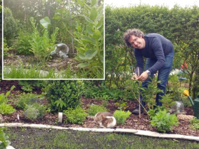 Ansonsten haben wir noch eine Rose und einen Buchsbaum im Staudenbeet. Buchsbäume hatten wir einige im Garten. Wie wir gelernt haben können ältere Buchsbäume auch blühen wenn man sie nicht vor der Blüte zurückschneidet, sie gelten ebenfalls als Bienenweide!