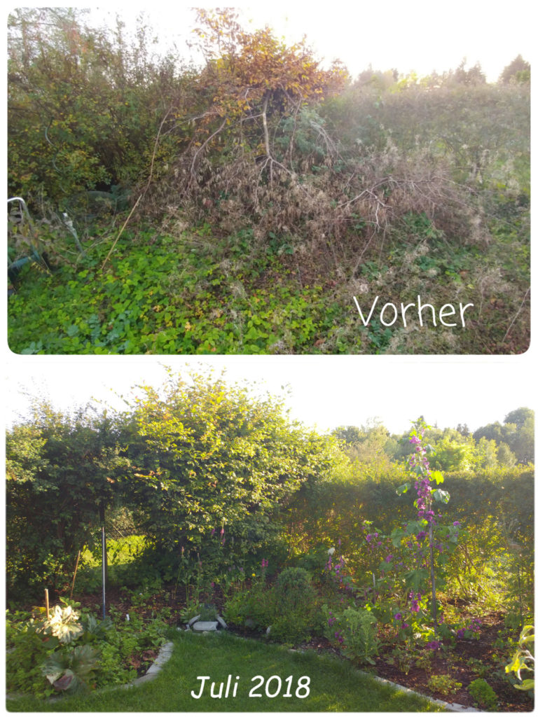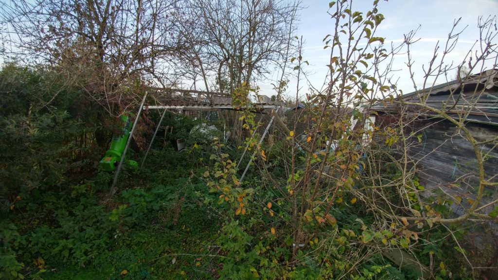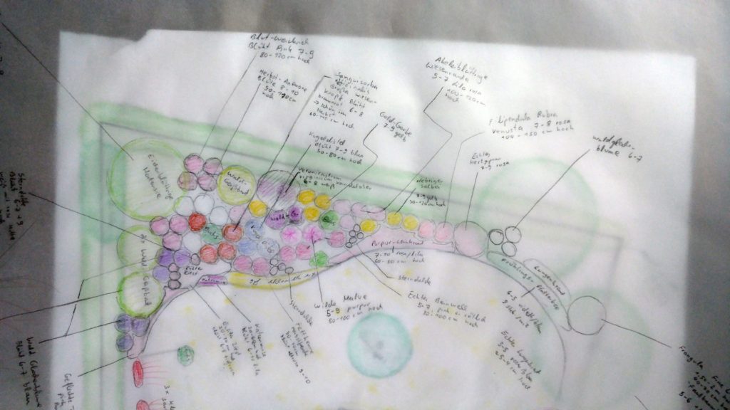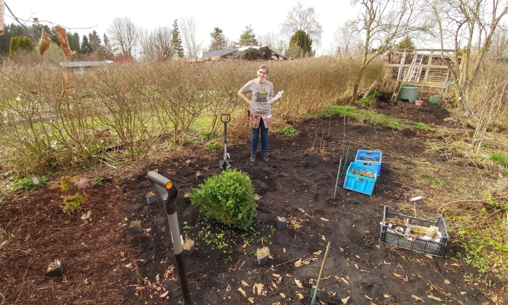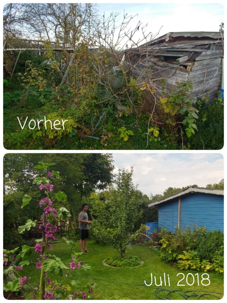 Wir haben im November 2017 eine verwilderte Kleingartenparzelle übernommen. Die Hütte steht mittig in dem länglichen Grundstück, wir planen daher zwei unterschiedliche Gartenhälften: Hinter die Hütte kommt ein Staudenbeet, eine kleine Rasenfläche und eine Terrasse auf der wir das (hoffentlich) schöne Staudenbeet genießen können. Vor der Hütte wollen wir Gemüse anbauen.