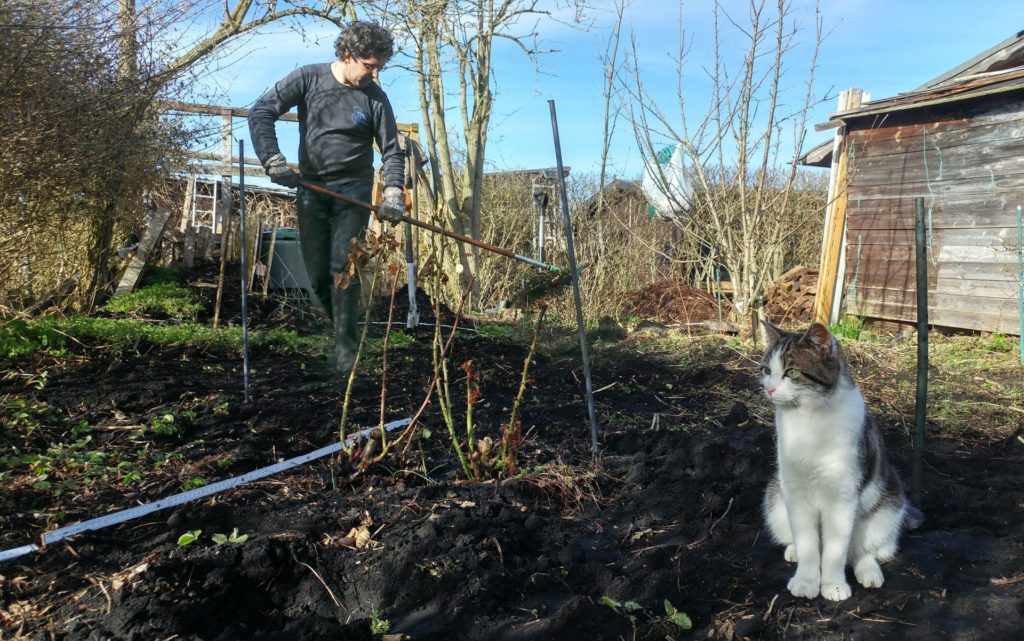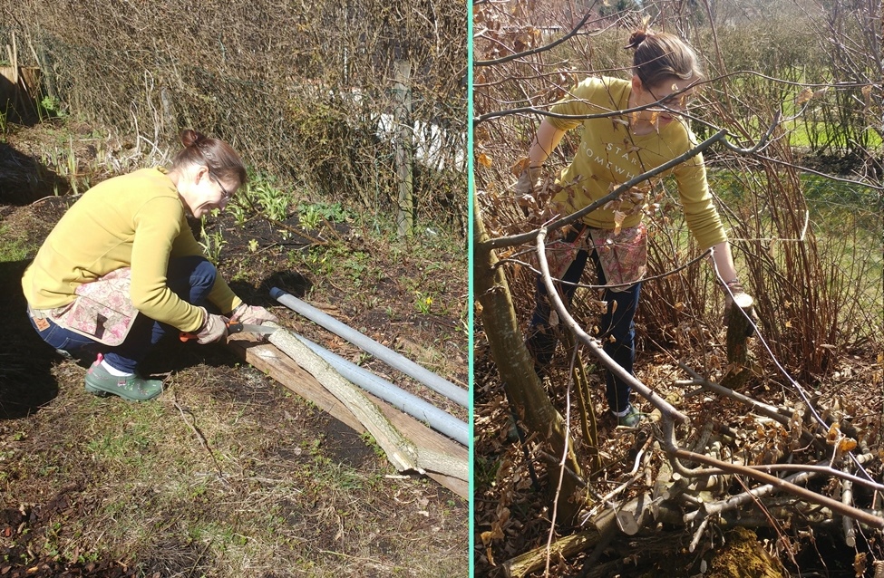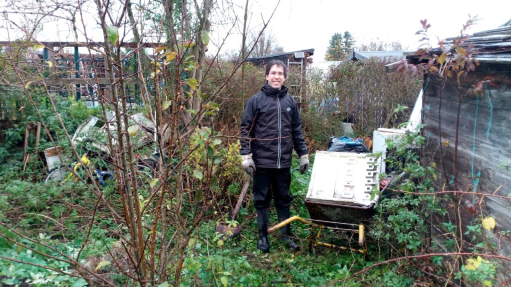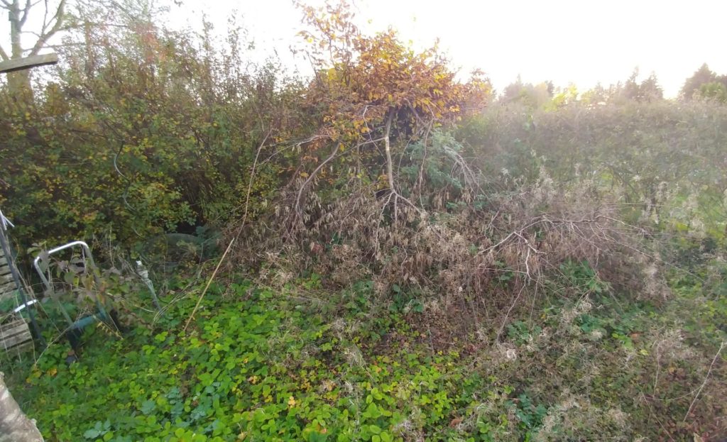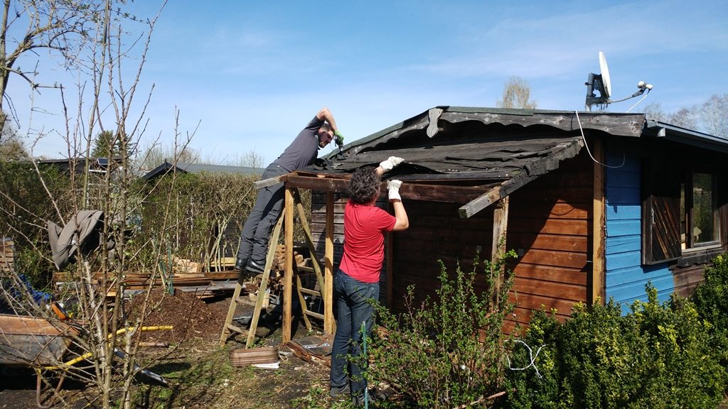 Wir haben im November 2017 eine verwilderte Kleingartenparzelle übernommen. Die Hütte steht mittig in dem länglichen Grundstück, wir planen daher zwei unterschiedliche Gartenhälften: Hinter die Hütte kommt ein Staudenbeet, eine kleine Rasenfläche und eine Terrasse auf der wir das (hoffentlich) schöne Staudenbeet genießen können. Vor der Hütte wollen wir Gemüse anbauen.
