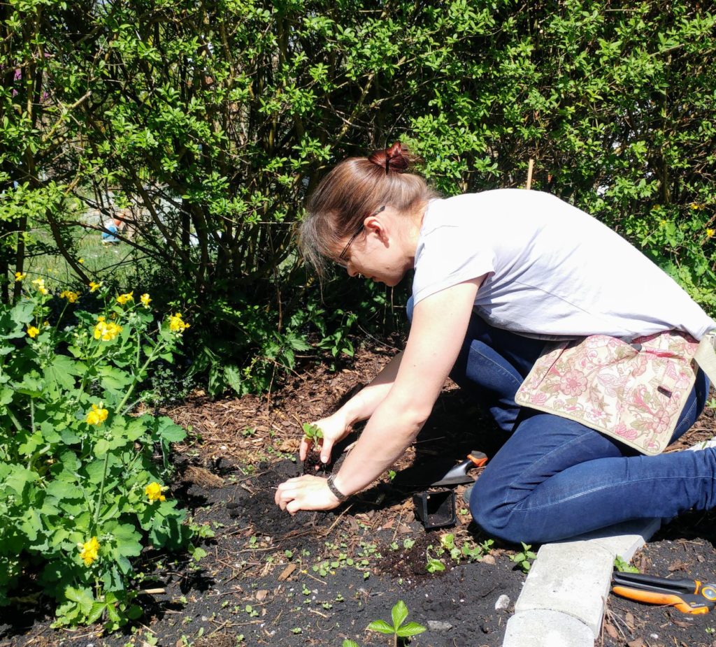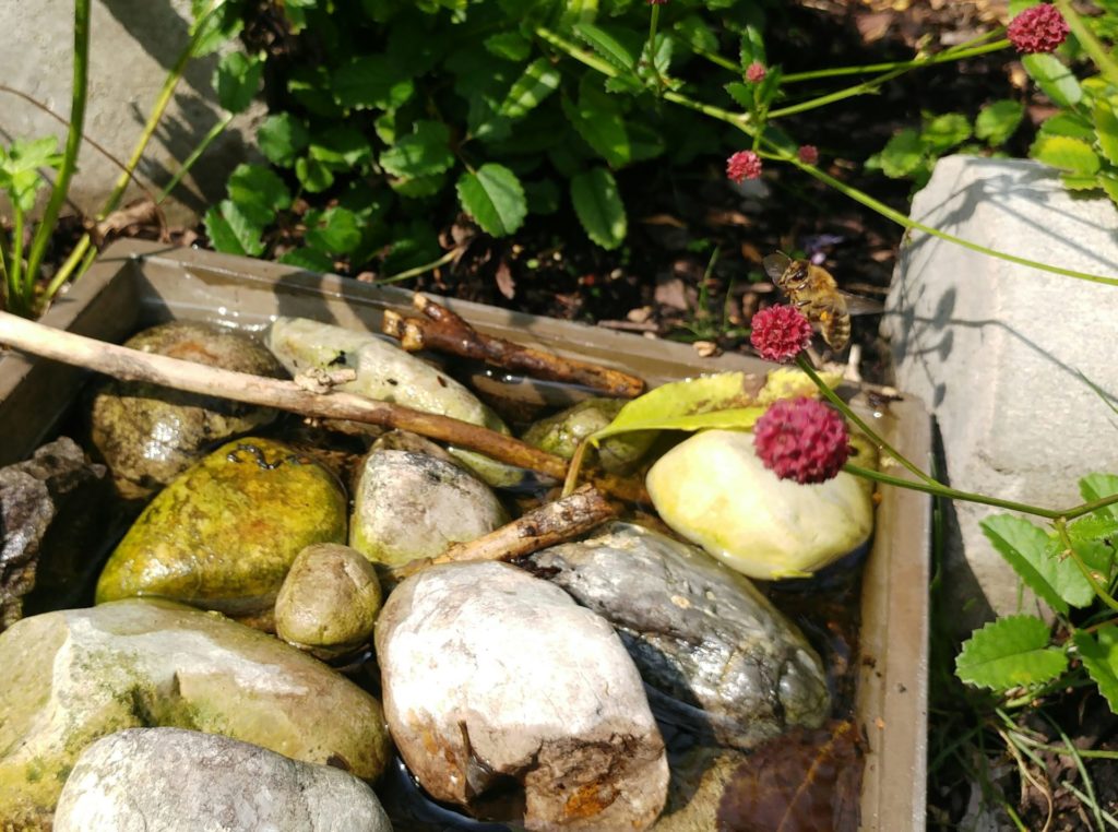 Ansonsten haben wir noch eine Rose und einen Buchsbaum im Staudenbeet. Buchsbäume hatten wir einige im Garten. Wie wir gelernt haben können ältere Buchsbäume auch blühen wenn man sie nicht vor der Blüte zurückschneidet, sie gelten ebenfalls als Bienenweide!