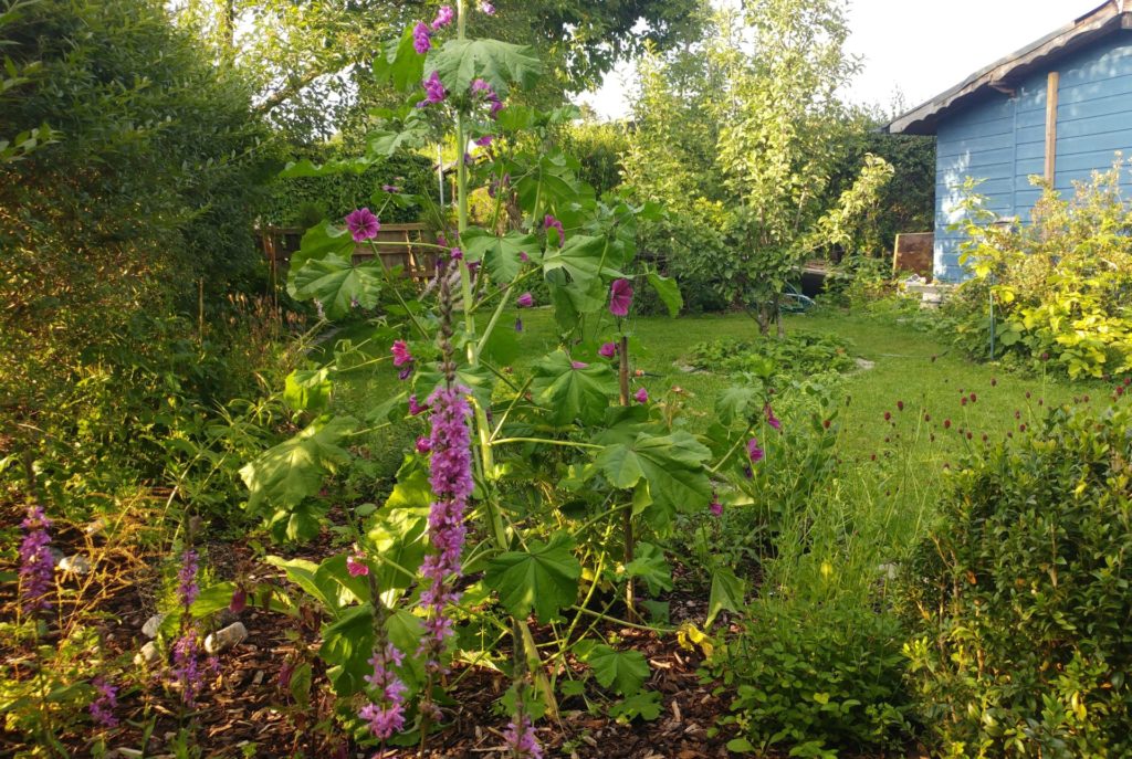 Lange Blütezeit, Wildstaude, Insektenweide. Die Pflanze haben wir erfolgreich selbst ausgesät! Die Samen hatten wir bei Saatgut-Vielfalt bestellt. - Wilde Malve (Malva sylvestris)