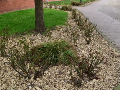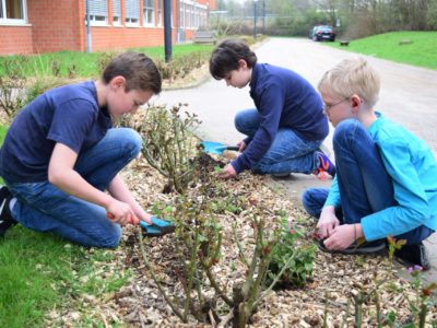 Auf unserem Schulgelände befinden sich mehrere, gemulchte Rosenbeete, die den Kindern zu langweilig erschienen, sodass sie diese verschönern wollten. Um gleichzeitig den Wildbienen, die im zeitigen Frühjahr unterwegs sind und Nektar suchen, verschiedene Nahrungsquellen bieten zu können, haben sie zwischen den Rosen verschiedene Frühblüher gesetzt. Diese Pflanzen, die nicht mehr verkauft werden sollten, haben wir von einem ortsansässigen Blumengeschäft gespendet bekommen. Die Idee, dass jene nicht weggeschmissen, sondern eingepflanzt werden, gefiel den Kindern besonders gut. Zusätzlich haben wir eine umgegrabene Rasenfläche mit Bienenfrend eingesät, um den (Wild-) Bienen im Hochsommer eine weitere Nahungsquelle bieten zu können.