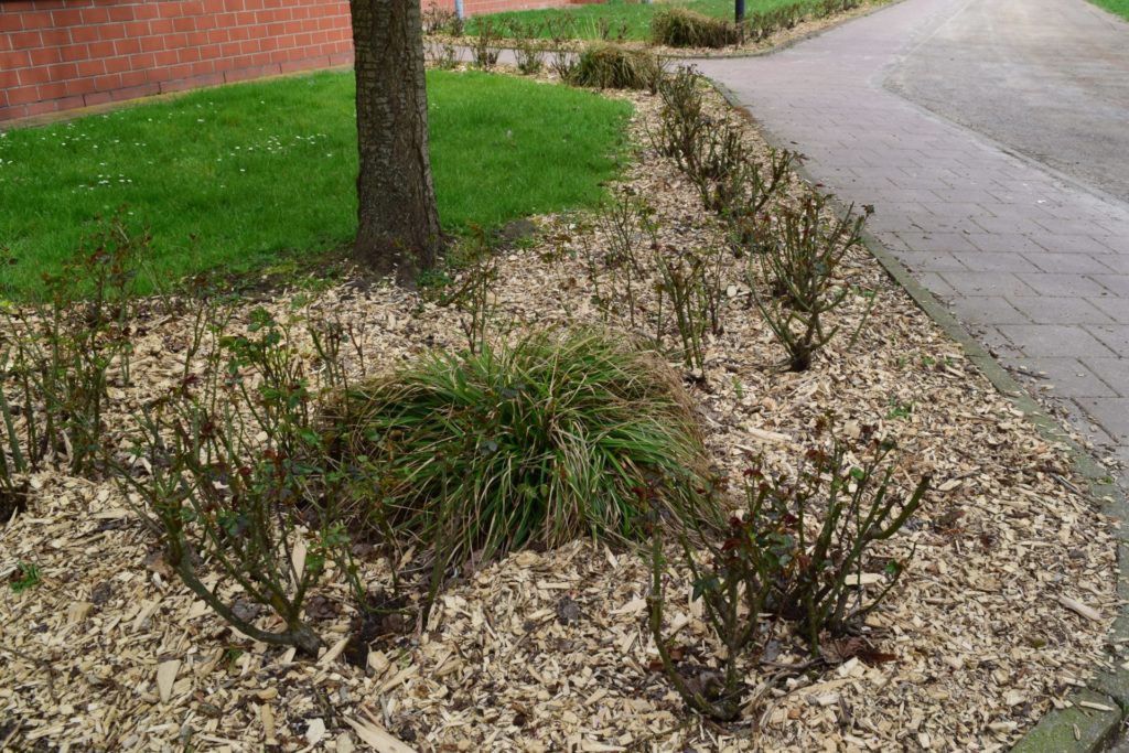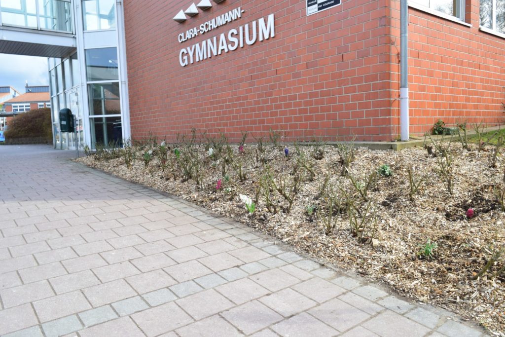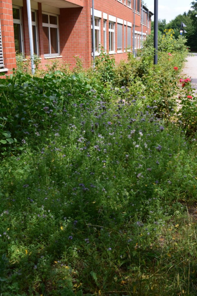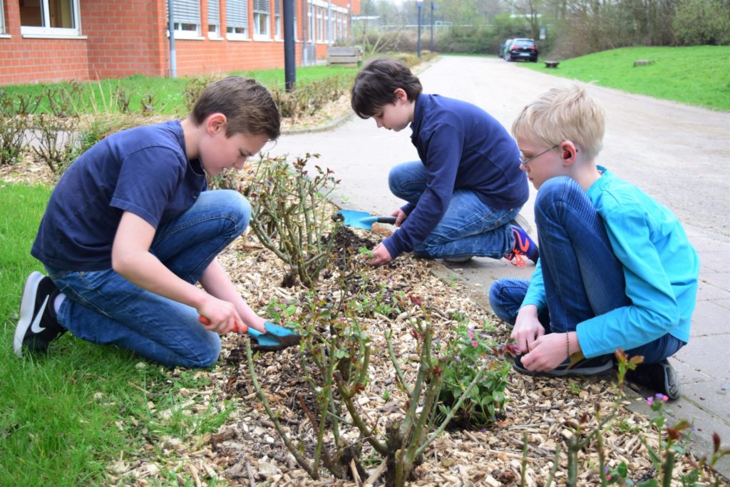 Auf unserem Schulgelände befinden sich mehrere, gemulchte Rosenbeete, die den Kindern zu langweilig erschienen, sodass sie diese verschönern wollten. Um gleichzeitig den Wildbienen, die im zeitigen Frühjahr unterwegs sind und Nektar suchen, verschiedene Nahrungsquellen bieten zu können, haben sie zwischen den Rosen verschiedene Frühblüher gesetzt. Diese Pflanzen, die nicht mehr verkauft werden sollten, haben wir von einem ortsansässigen Blumengeschäft gespendet bekommen. Die Idee, dass jene nicht weggeschmissen, sondern eingepflanzt werden, gefiel den Kindern besonders gut. Zusätzlich haben wir eine umgegrabene Rasenfläche mit Bienenfrend eingesät, um den (Wild-) Bienen im Hochsommer eine weitere Nahungsquelle bieten zu können.