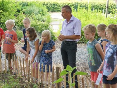 - Im Schulkräuterbeet, 70 qm: Thymian, Lavendel und Rosmarin, Flieder und Weigelie sowie einer Hecke aus Holunder, Weißdorn und Schlehdorn