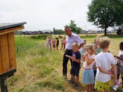 Nach dem Bau der beiden Insektenhotels wurden diese auf den Flächen aufgestellt und werden von der jetzigen Klasse 3c mit ihrer Lehrerin Frau Clemens als Paten in Ordnung gehalten.