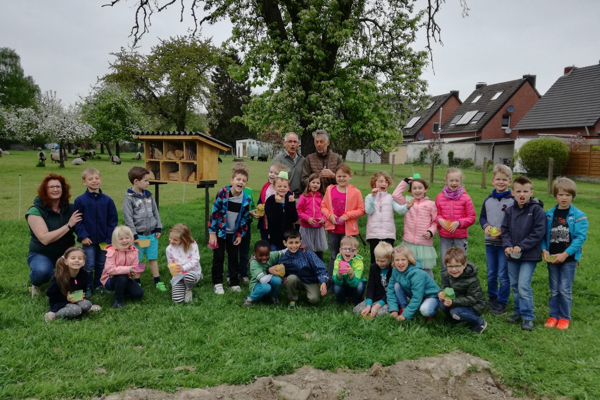 Nach dem Bau der beiden Insektenhotels wurden diese auf den Flächen aufgestellt und werden von der jetzigen Klasse 3c mit ihrer Lehrerin Frau Clemens als Paten in Ordnung gehalten.