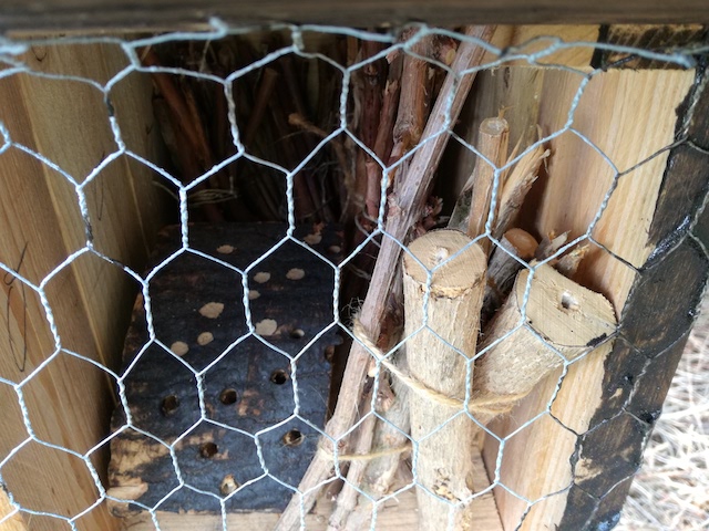 Ein weiteres Hotel fand am Waldrand neben einer Wildschutzfläche, die wir mit den Revierpächtern eingesät hatten, seinen Platz. Darin haben inzwischen schon Bienen ein neues Zuhause gefunden, denn die von uns gebohrten Löcher im angebohrten Eichenholz sowie das Mark in den toten Himbeerästen sind von den Tierchen bewohnt und zugestopft worden.