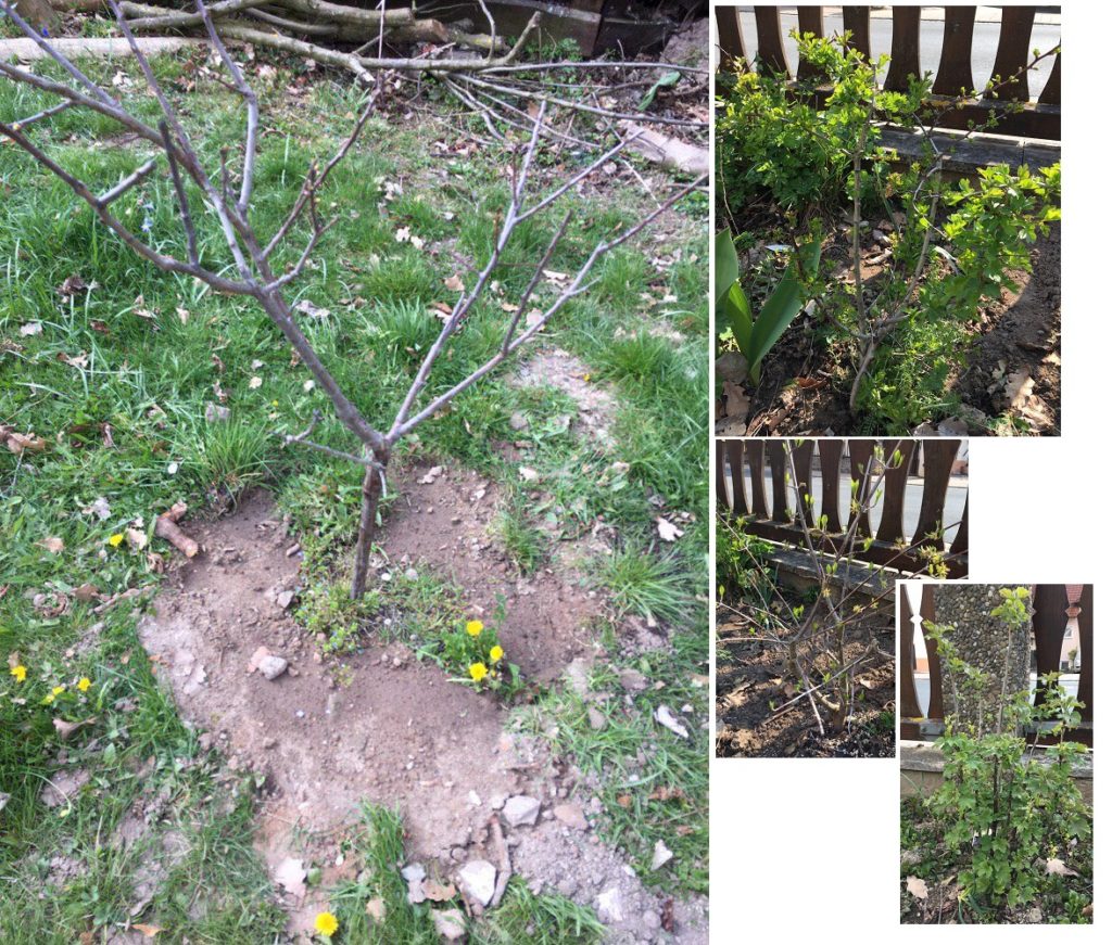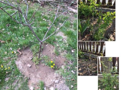 Gehölze, Anfang April gesetzt: Apfelbaum (Malus domestica, in die Wiese), Johannisbeere (Ribes rubrum, an den Zaun), Kornellkirsche (Cornus mas, an den Zaun), eingriffliger Weißdorn (Crataegeus monogyna, an den Zaun)