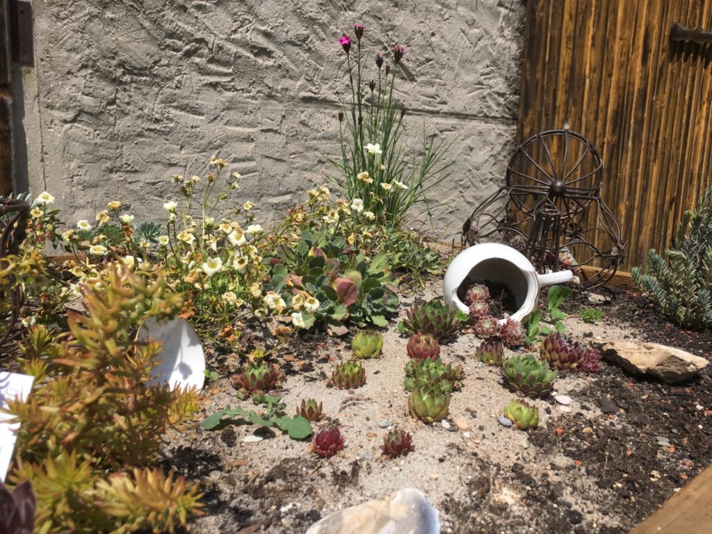 Pflanzen/Stauden: Beifuß (Artemisia vulgaris), Berg-Steinkraut (Alyssum montanum), Bergminze (Clinopodium nepeta), Blaukissen (Aubrieta), Borretsch (Borago officinalis ), Echte Schlüsselblume (Primula veris), Einjährige Silberblatt (Lunaria annua), Eisenkraut (Verbena officinalis), Fetthennen (Sedum album, acre, tripmadam, telephium, spectabile, reflexum), Flockenblume (Centaurea jacea und pseudophrygia), Glockenblume (Campanula rotundifolia und thyrsoides), Hauswurz (Sempervivum verschiedene Arten und Sorten), Himmelsschlüssel (Primula elatior), Karthäuser-Nelke (Dianthus carthusianorum), Kleine Wiesenknopf (Sanguisorba minor), Kriechende Jakobsleiter (Polemonium reptans), Lungenkraut (Pulmonaria officinalis und dacica), Mittagsblumen (Delosperma), Moos-Steinbrech (Saxifraga x Arendesii), Ochsenauge (Buphthalmum salicifolium), orangrotes Habichtskraut (Hieracium aurantiacum), Pfefferminze (Mentha × piperita), Seifenkraut (Saponaria ocymoides), Wald-Geißbart (Aruncus dioicus), Waldmeister (Galium odoratum), Weinraute (Ruta graveolens), Wiesenschaumkraut (Cardamine pratensis), Wolfsmilch (Euphorbia myrsintes)