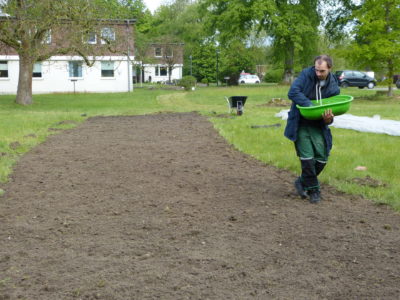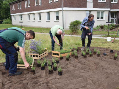 Die Projektgruppe war mit Begeisterung bei der Sache. Es wurde gegraben, gepflanzt, gestaltet und gelacht. Alle Beteiligten hatten großen Spaß daran, den Bienen auf dem weitläufigen Betriebsgelände der Stiftung eine schöne Heimstatt zu schaffen. Das Gelände verfügt mit Wiesen, Weiden und dem Lutter-Bach über sehr gute Voraussetzungen, um für die gefährdeten Bestäuber etwas zu tun. Das dies dringend erforderlich, soll im Rahmen des Projektes ebenfalls erfahrbar gemacht werden. Eine Holzbank die nach Beendigung der Arbeiten am Rande der Projektwiese aufgestellt wird, soll Mitarbeitende, Klienten und Besucher der Stiftung zum Verweilen und Beobachten einladen und für das Thema Arten- und Umweltschutz sensibilisieren.