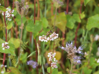 Bienennährgehölze bieten weitere Nahrung. Dazu wurden zwei Wildgehölzinseln geschaffen, bestehend aus Eberesche, Wildrosen, Liguster, Mispel und Faulbaum.