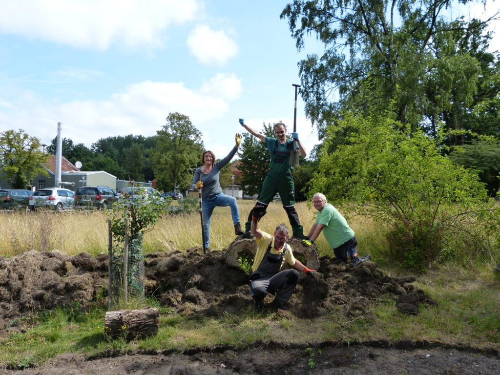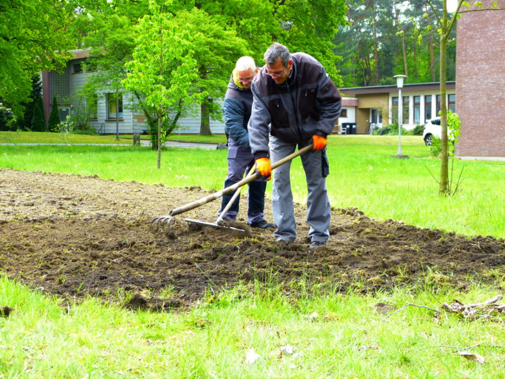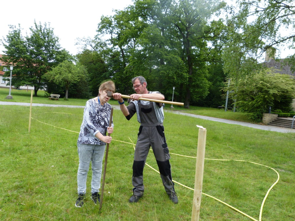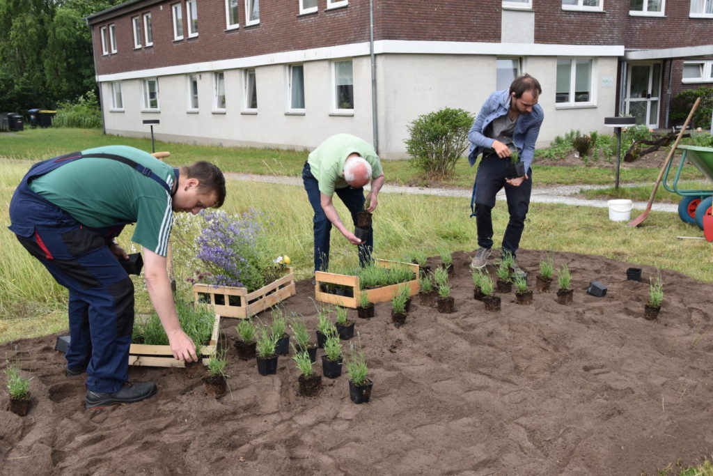 Die Projektgruppe war mit Begeisterung bei der Sache. Es wurde gegraben, gepflanzt, gestaltet und gelacht. Alle Beteiligten hatten großen Spaß daran, den Bienen auf dem weitläufigen Betriebsgelände der Stiftung eine schöne Heimstatt zu schaffen. Das Gelände verfügt mit Wiesen, Weiden und dem Lutter-Bach über sehr gute Voraussetzungen, um für die gefährdeten Bestäuber etwas zu tun. Das dies dringend erforderlich, soll im Rahmen des Projektes ebenfalls erfahrbar gemacht werden. Eine Holzbank die nach Beendigung der Arbeiten am Rande der Projektwiese aufgestellt wird, soll Mitarbeitende, Klienten und Besucher der Stiftung zum Verweilen und Beobachten einladen und für das Thema Arten- und Umweltschutz sensibilisieren.