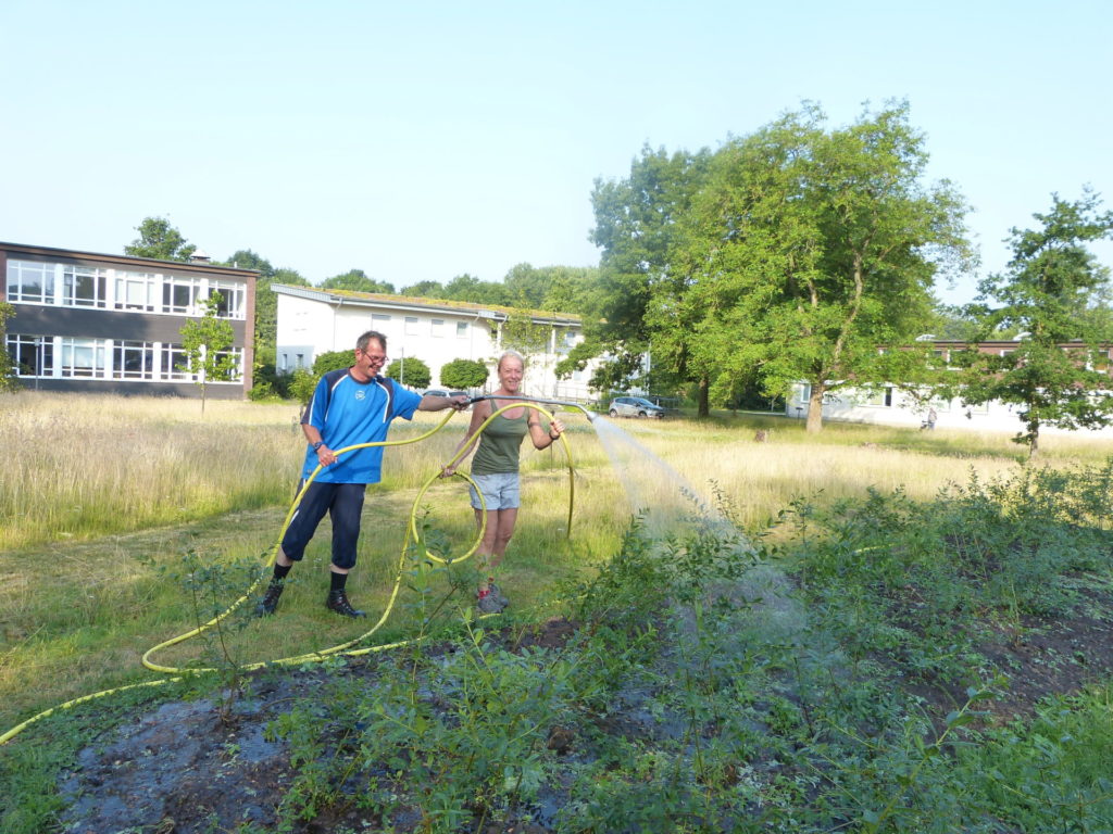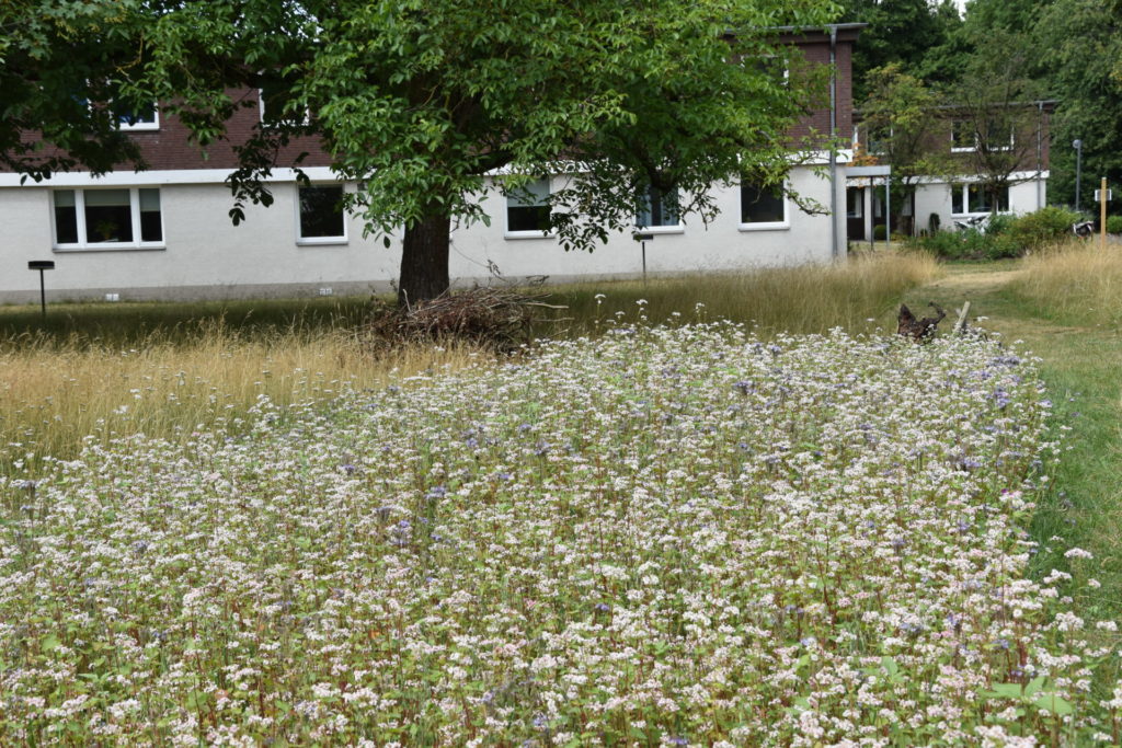Die Projektgruppe legte einen Blühstreifen an, mit einer bienenfreundlichen Wildackermischung aus Sonnenblumen, Malven, verschiedenen Gräsern, Bienenfreund und Dinkel.