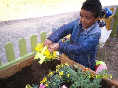 Die Kinder haben das Hochbeet gut mit Blumenerde aufgefüllt, nun geht es an`s pflanzen. Wir haben verschiedene Blumenstauden ausgesucht, die wir für die Bienen als gut empfunden haben.