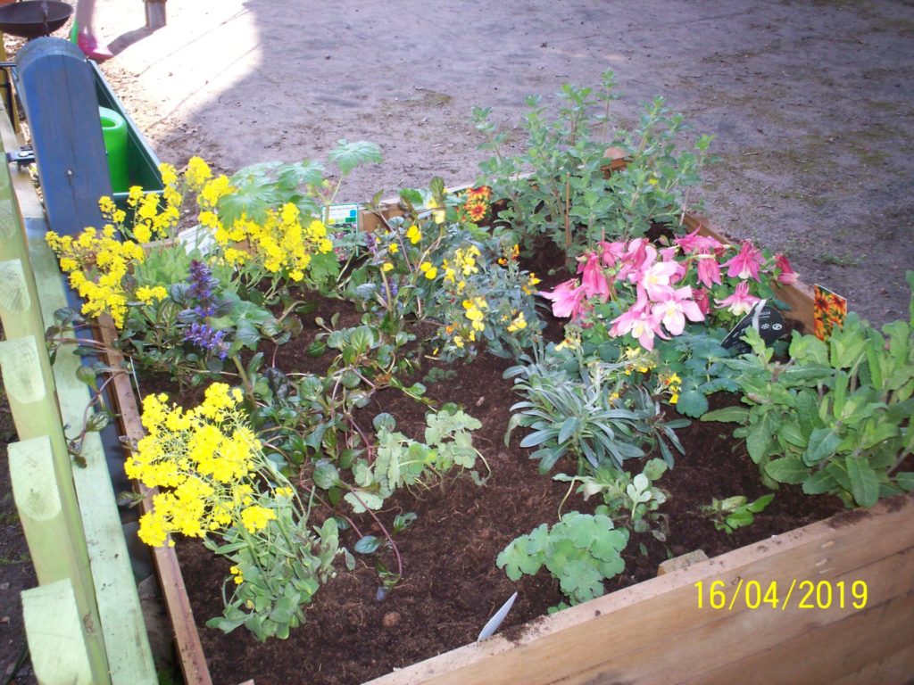 Die Kinder haben das Hochbeet gut mit Blumenerde aufgefüllt, nun geht es an`s pflanzen. Wir haben verschiedene Blumenstauden ausgesucht, die wir für die Bienen als gut empfunden haben.