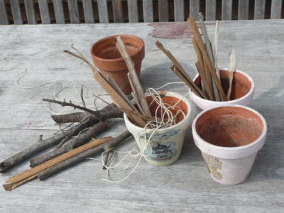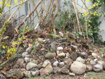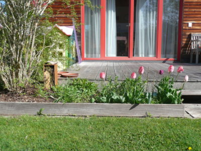 Dieses Jahr im März kamen die Wasserstellen und der Topf-Kräutergarten dazu. Die Staudenbeete habe ich durch Teilung der Stauden vergrößert, damit die Blüte reichlicher ausfällt. Im April haben wir 3 Insektenhotels aufgestellt und Himbeerzweige in die Erde gesteckt, damit die Insekten Unterschlupf finden. Aufgeschichtete Falzziegel, umgedrehte Tontöpfe und eine Sandlinse dienen ebenso als Unterschlupf für die Nützlinge.