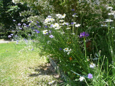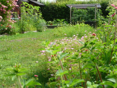 Ganz neu ist das Wildblumenbeet auf der Rasenfläche, das hoffentlich bald zum Blühen kommt.