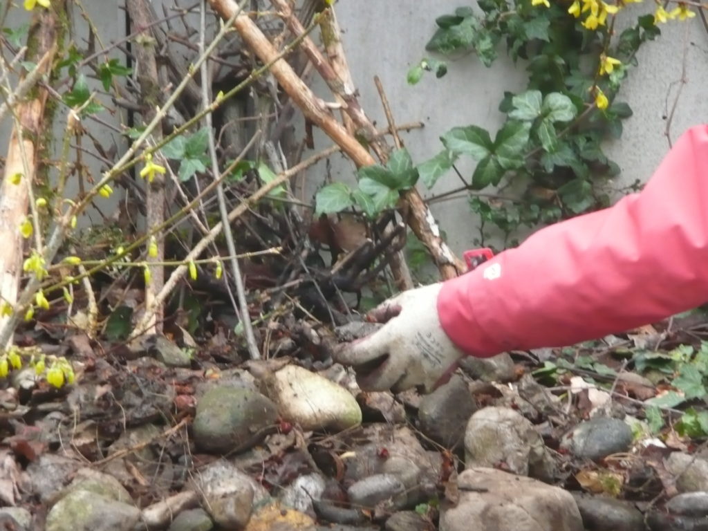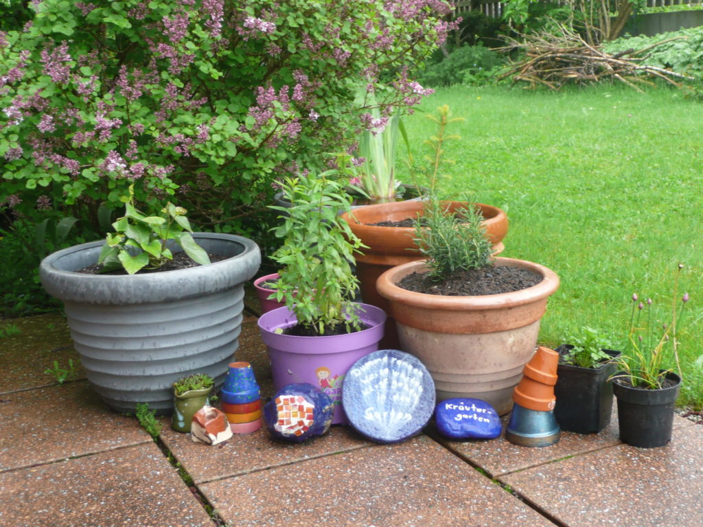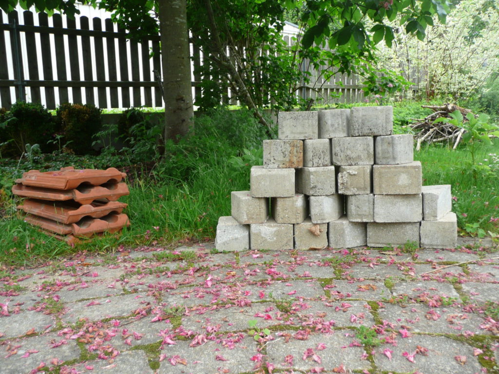 Dieses Jahr im März kamen die Wasserstellen und der Topf-Kräutergarten dazu. Die Staudenbeete habe ich durch Teilung der Stauden vergrößert, damit die Blüte reichlicher ausfällt. Im April haben wir 3 Insektenhotels aufgestellt und Himbeerzweige in die Erde gesteckt, damit die Insekten Unterschlupf finden. Aufgeschichtete Falzziegel, umgedrehte Tontöpfe und eine Sandlinse dienen ebenso als Unterschlupf für die Nützlinge.