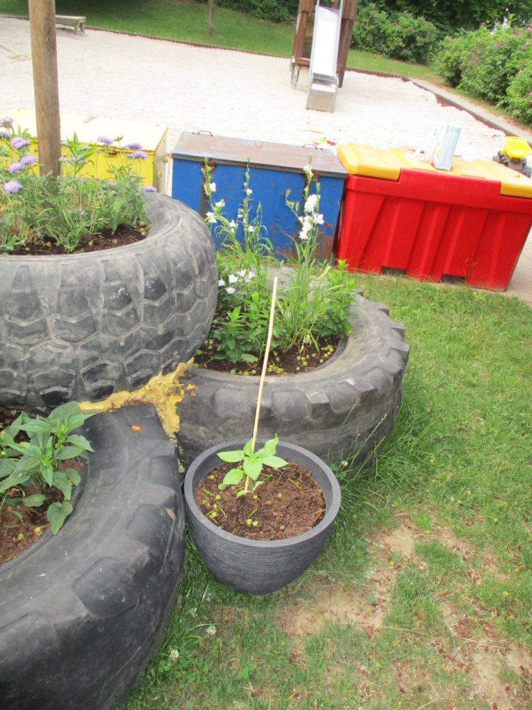 Die zukünftigen Vorschüler der Kita "Unter dem Regenbogen" in Stollberg (Erz) haben schon seit einiger Zeit ein Projekt zum Thema "Bienen, Hummel, Wespen, usw.". Da passt das Projekt "Pflanzwettebewerb" unter dem Motto "Wir tun was für Bienen" super dazu. Wir haben unsere Beete aus alten Traktorreifen angelegt, welche wir von der Familie Grimm in Stollberg bekommen haben. Die Beete sind mit bienenfreundlichen Pflanzen von den Kindern bestückt worden. Bei der Auswahl der Pflanzen wurde darauf geachtet dass diese in unterschiedlichen Zeiten blühen und somit den Bienen den ganzen Sommer über als Nahrungsquelle zur Verfügung stehen.