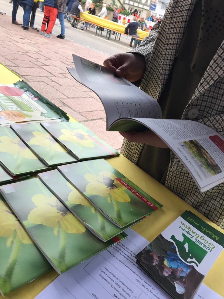 An einem verkaufsoffenen Sonntag gestaltete die Wildlife Jugend Güglingen, neben musikalischer Unterhaltung und großem Kunsthandwerkermarkt, einen bunten Stand beim Palmmarkt in der Innenstadt Güglingens. Trotz Kälte gab es hier gute Laune! Die warmen Waffeln und leckeren Gebäckstücke lockten schnell Jung und Alt. Besonders interessiert waren die Besucher*innen an dem Honigjagd-Spiel. Ziel war es, so oft wie möglich aus einem bestimmten Abstand den Honigtopf hinter den Blumen-Löchern zu treffen. Eine Herausforderung für jedermann! Natürlich gab es auch eine kleine Belohnung am Ende des Spiels: Die schmackhhaften süßen Bienenkekse, die die Wildlife Jugend Güglingen selbst gebacken hatte, sorgten für ein Lächeln. Durch das erfolgreiche Spiel und den Broschüren ,,Wir tun was für Bienen‘‘ machte die Wildlife Jugend Güglingen auf das Engagement für Wildbienen aufmerksam.