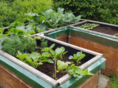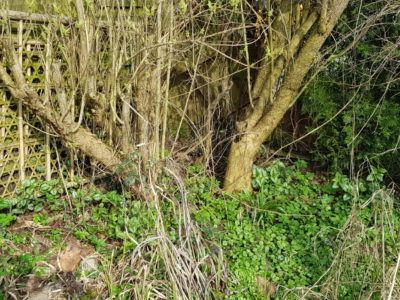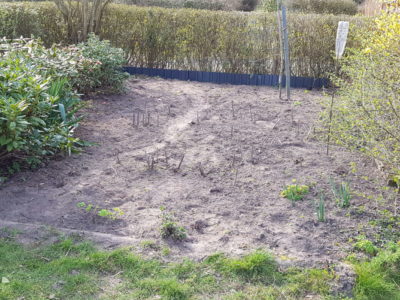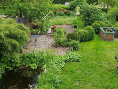 Eine Ligusterhecke um die Parzelle herum bietet Windschutz. Zusammen mit einem 12qm großen Teich wird ein insektenfreundliches Kleinklima erzeugt .