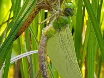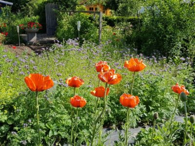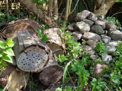 Komposthaufen, Hummelnest, Kräuterbeet, Steinhaufen, Totholzhaufen und Trockenmauer warten auf die krabbelnden und fliegenden Insekten. In kontrollierten Bereichen nutze ich Giersch als Bodendecker und natürlichen Verdunstungsschutz. Auch Brennesseln bieten sich den Insekten an.