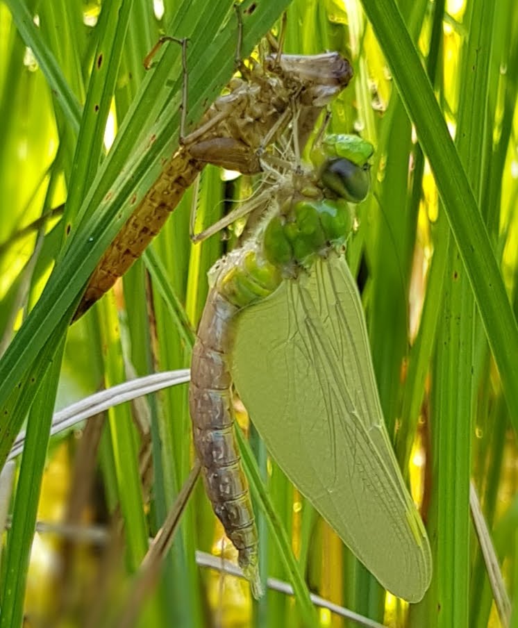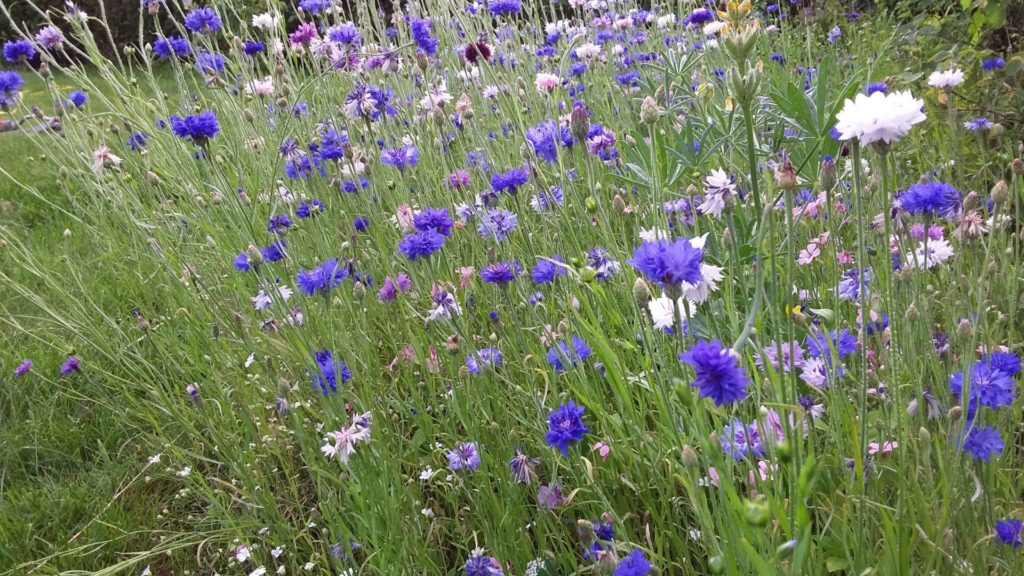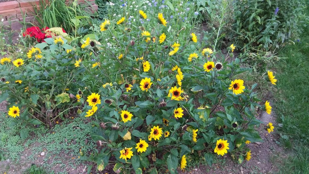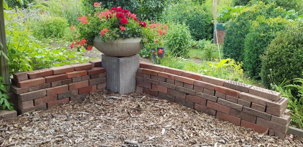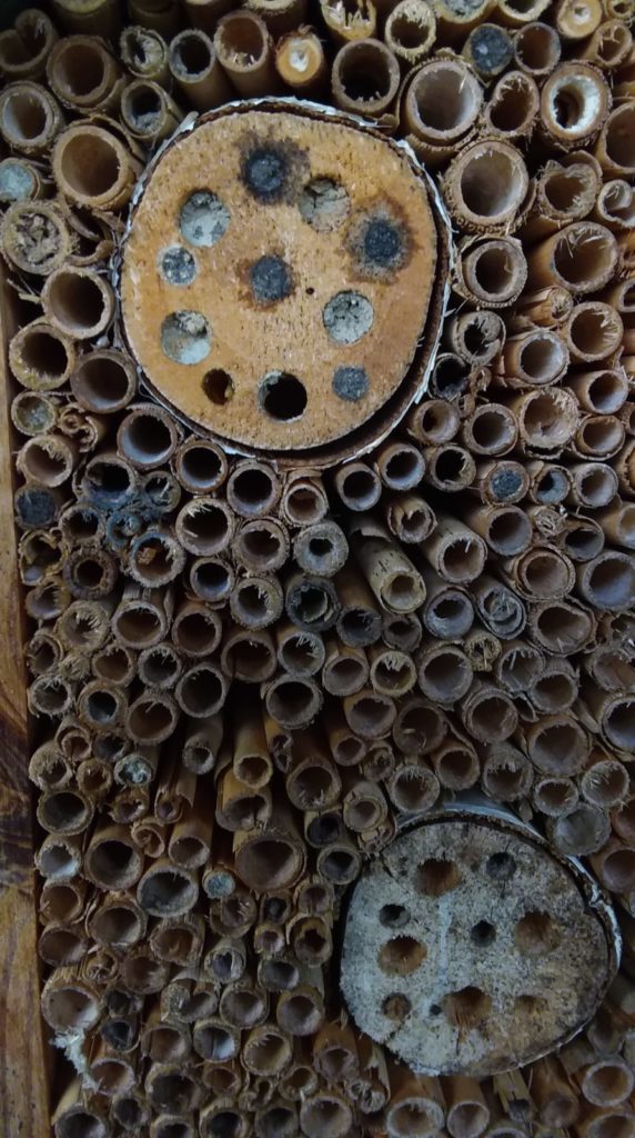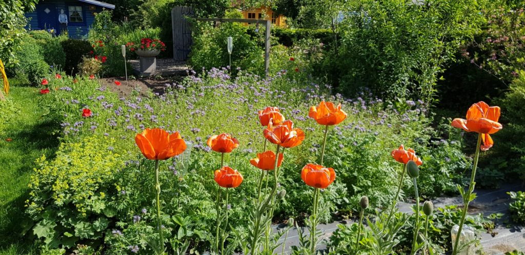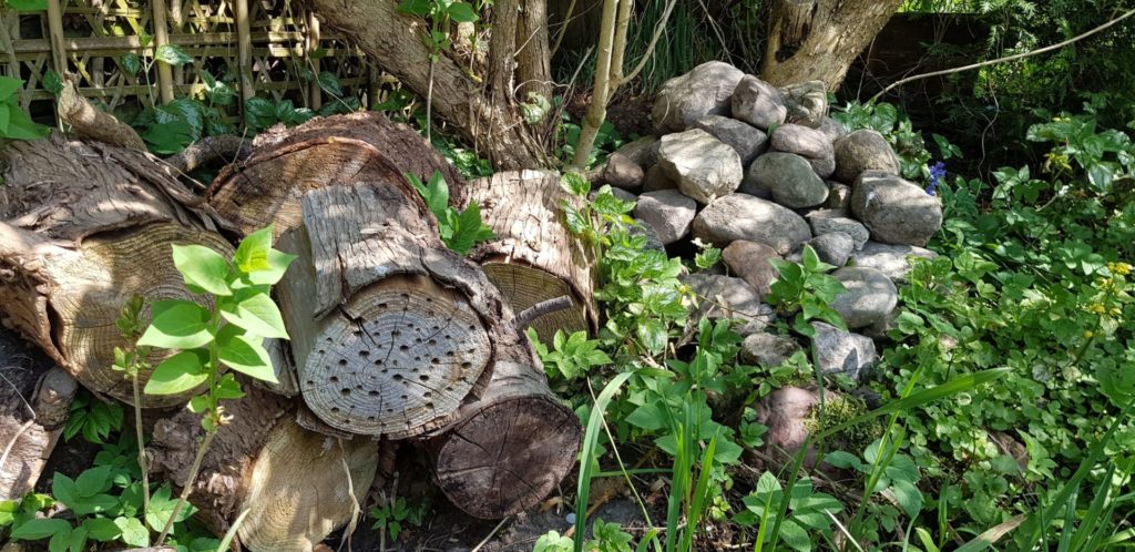 Komposthaufen, Hummelnest, Kräuterbeet, Steinhaufen, Totholzhaufen und Trockenmauer warten auf die krabbelnden und fliegenden Insekten. In kontrollierten Bereichen nutze ich Giersch als Bodendecker und natürlichen Verdunstungsschutz. Auch Brennesseln bieten sich den Insekten an.