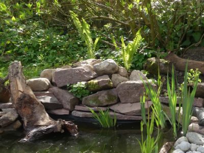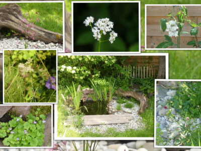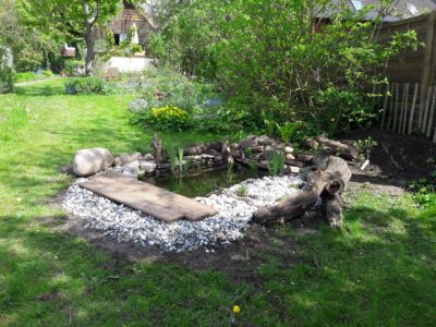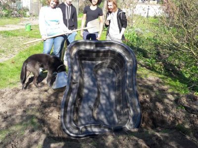 Projekt 4 Ist ein Teich mit Wasserpflanzen und einem breiten Uferstreifen, der mit den typischen Pflanzen bestückt werden soll. Geplant sind Mädesüß, Wasserdost und Baldrian. Dieses Projekt konnte Anfang Mai abgeschlossen werden.