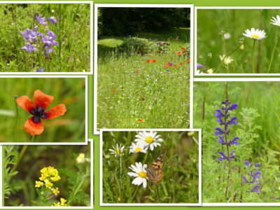 Die große Rasenfläche soll an verschiedenen Stellen mit Blumenwiesen, Hotspot (Magerbereich) und Teich aufgewertet werden. Es werden bevorzugt einheimische Wildblumen und Sträucher eingesetzt.