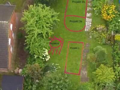 Projekt 1 Die Fläche ist ungefähr 8 qm groß, hier soll eine Wildblumenwiese entstehen. Wir haben auf der Fläche im Spätsommer Grassoden und 15 cm Humus abgetragen und etwa eine halbe Tonne Sand eingearbeitet. Im Herbst wurden Krokusszwiebel gesetzt und eine Wildblumensaatmischung aufgebracht. Im April wurden die vorgezogenen Stauden in die Lücken gesetzt.