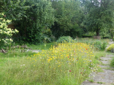Ein 1 m breiter Streifen zum Magerbeet, hier wurden Grassoden entfernt und den anstehenden Boden mit Sand gemischt. Anschließend einheimische Wildblumen-Saatmischung ausgesät.