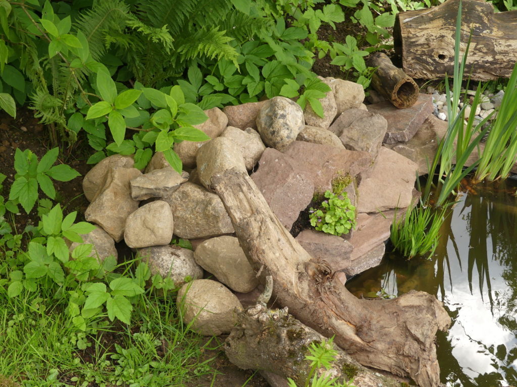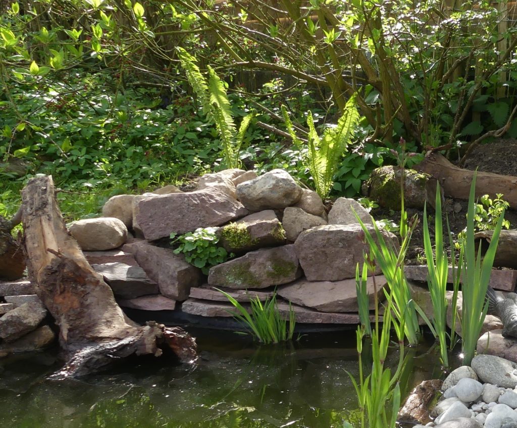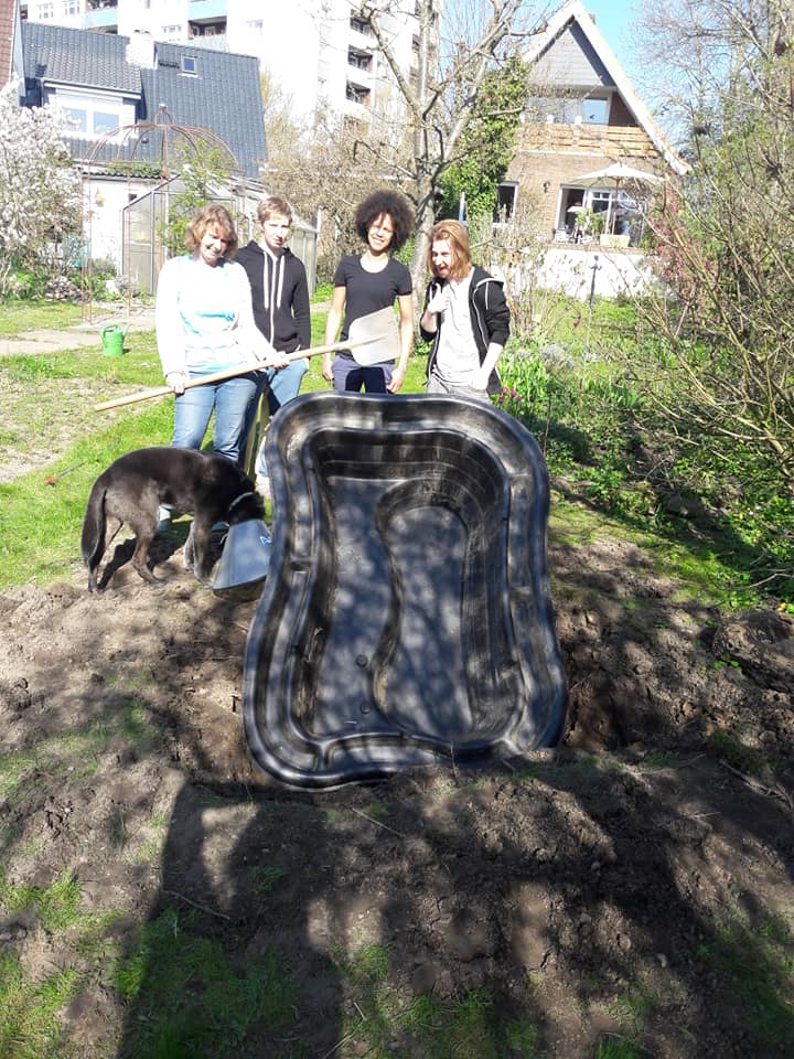 Projekt 4 Ist ein Teich mit Wasserpflanzen und einem breiten Uferstreifen, der mit den typischen Pflanzen bestückt werden soll. Geplant sind Mädesüß, Wasserdost und Baldrian. Dieses Projekt konnte Anfang Mai abgeschlossen werden.
