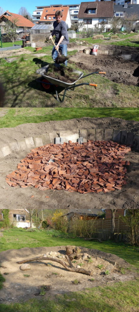 Projekt 3 Teil a Aus den bei Projekt 1 angefallenen Grassoden wurde ein Wall gebaut, der den Bereich für Projekt 3a halbkreisförmig einfasst, hier entstand seit Februar 2019 eine Hotspotzone, die Anfang April abgeschlossen werden konnte.