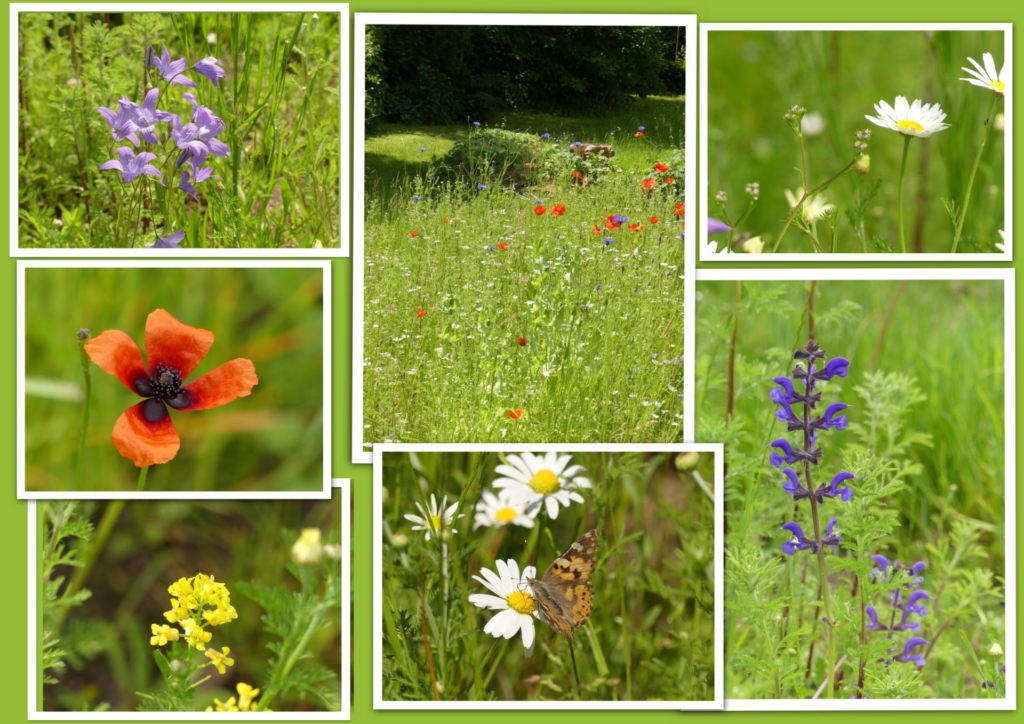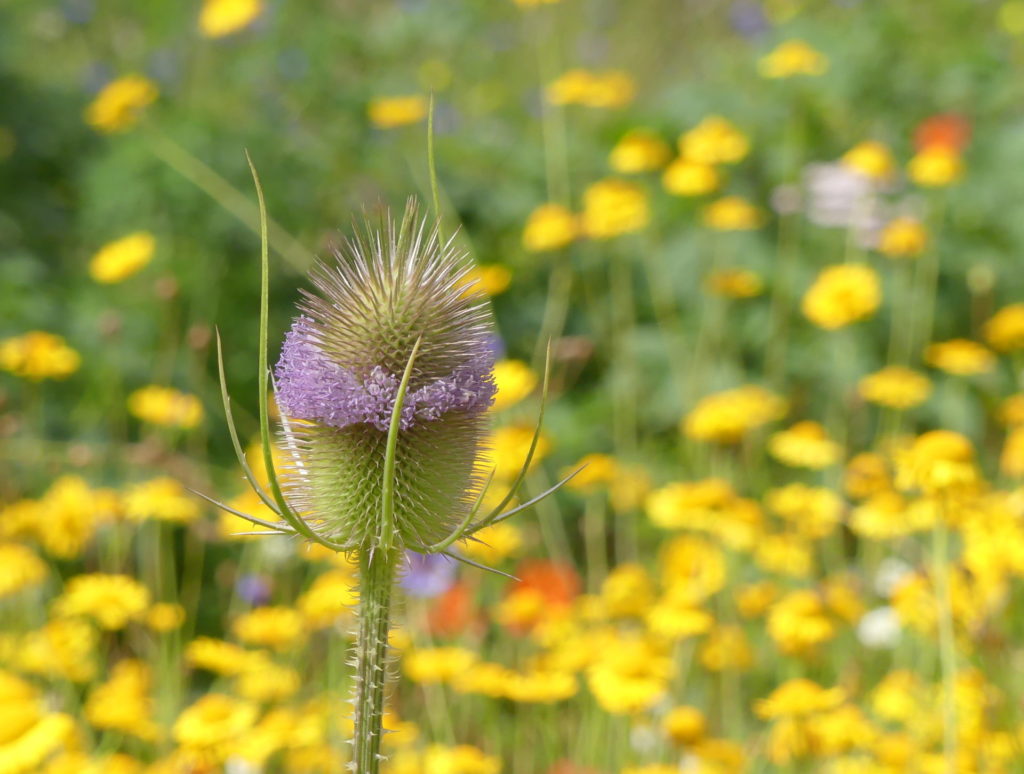 Wiesenglockenblume, Karde, Wiesensalbei, Mariendiestel, Ähriger Ehrenpreis, Natternkopf und echtes Leimkraut.