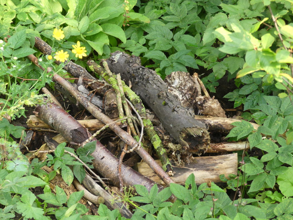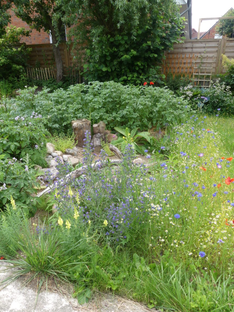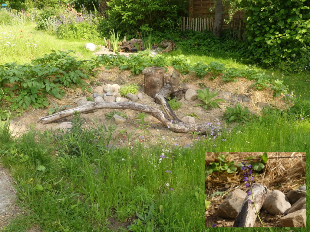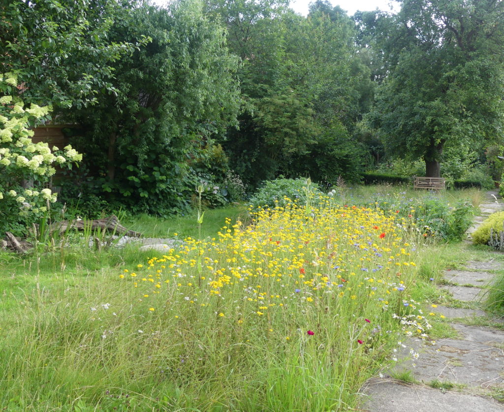 Ein 1 m breiter Streifen zum Magerbeet, hier wurden Grassoden entfernt und den anstehenden Boden mit Sand gemischt. Anschließend einheimische Wildblumen-Saatmischung ausgesät.