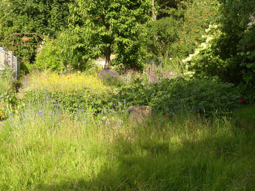 Beim Rest kleine Flächen vom Rasenfilz befreit und vorgezogene Wildstauden gesetzt und Wildblumensaat verteilt.