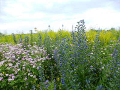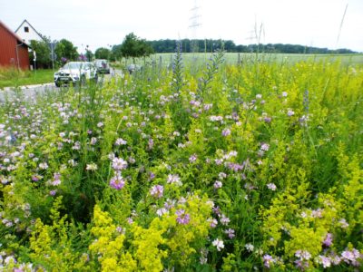Es handelt sich um eine Mischung von 14 bunt blühenden einjährigen Ackerwildkräutern, welche im ersten Jahr einen sehr bunten Blühaspekt bot. Außerdem wurden 32 Arten von Wiesenblumen mit eingesät, welche für die nachfolgenden Jahre immer einen bunten Aspekt lieferten. Es handelt sich ausschließlich um gebietsheimische Wildsaaten der Firma Rieger-Hofmann aus dem Raum 7.