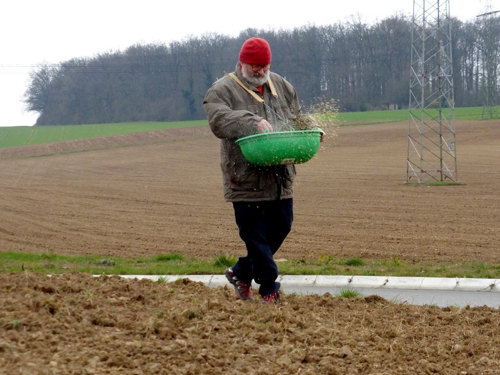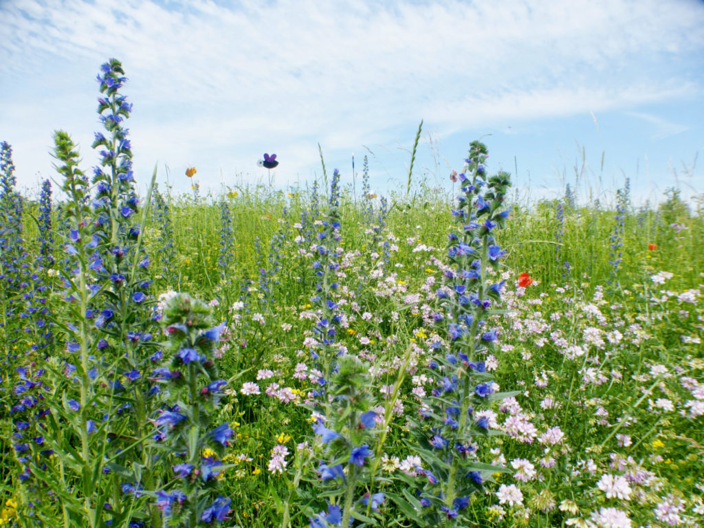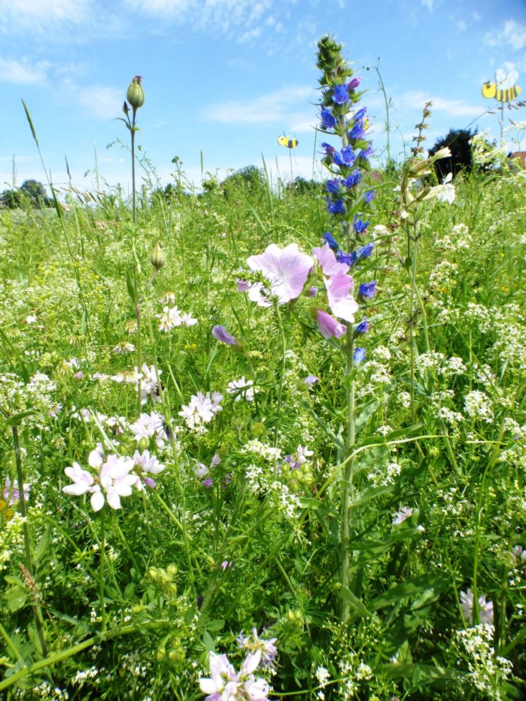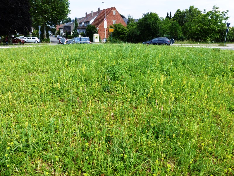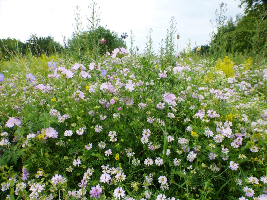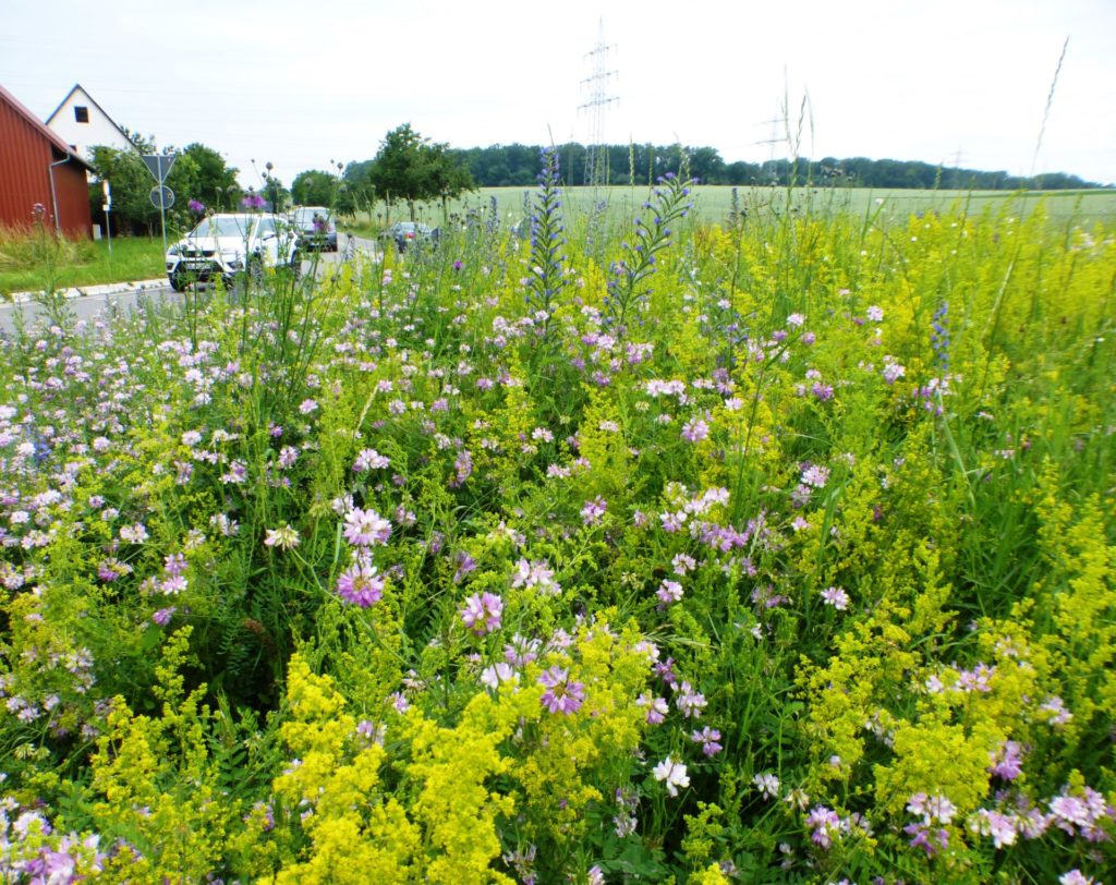 Es handelt sich um eine Mischung von 14 bunt blühenden einjährigen Ackerwildkräutern, welche im ersten Jahr einen sehr bunten Blühaspekt bot. Außerdem wurden 32 Arten von Wiesenblumen mit eingesät, welche für die nachfolgenden Jahre immer einen bunten Aspekt lieferten. Es handelt sich ausschließlich um gebietsheimische Wildsaaten der Firma Rieger-Hofmann aus dem Raum 7.