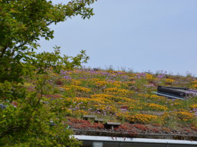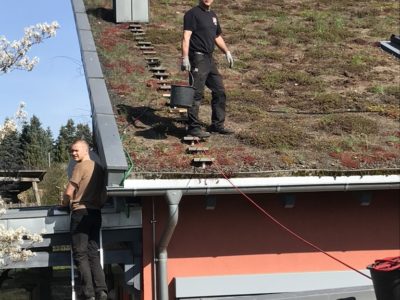 Extensive Dachbegrünung: Mauerpfeffer, Fetthenne, diverse Kräuter wie z. B. Schnittlauch und Gräser