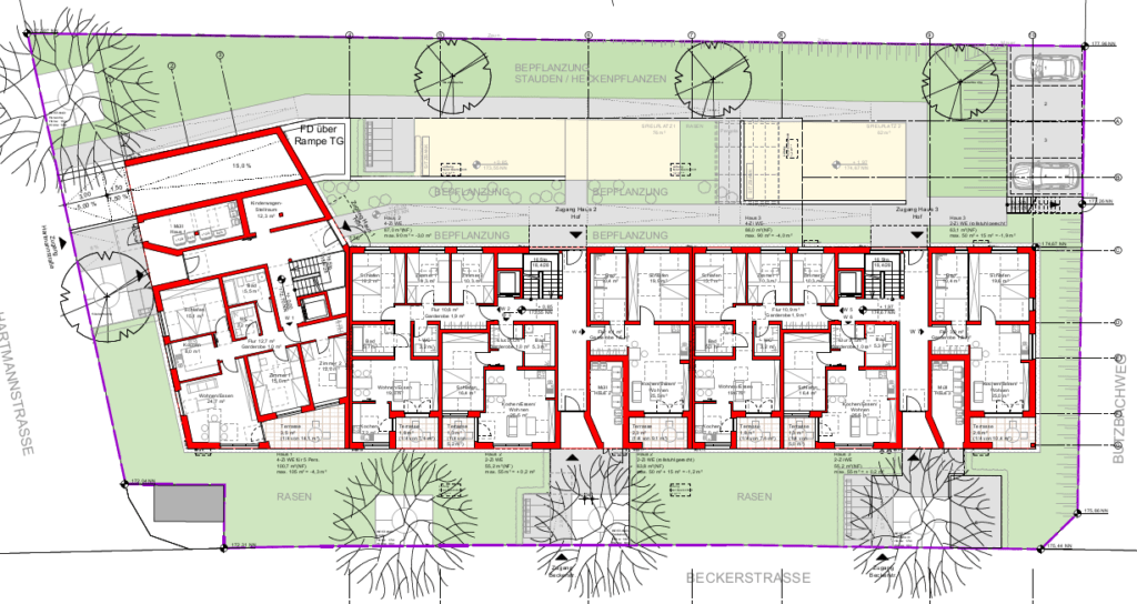 Aus dem stark verwilderten und vernachlässigtem Grundstück der alten Jugendherberge wurde durch einen Neubau und die damit verbundene Umgestaltung der Außenanlage mit verschiedenen Bodendeckern, Sträuchern, Bäumen in Verbindung mit verschiedenen Staudenmischpflanzungen eine Oase für Mensch und Tier geschaffen. Bei der Baumauswahl hat man sich bewusst für Feldahorn und Amberbäume entschieden, da diese zu den zukunfts-/ stadtklimafesten Baumarten zählen und sich somit für die stetig ändernden Wetterlagen, sprich Klimawandel, am besten eignen.