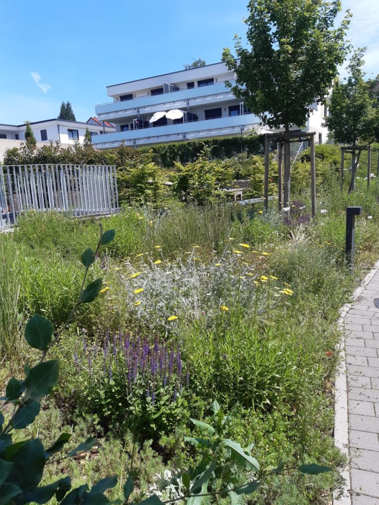 Durch das Wechselspiel der verschiedenen Staudenmischungen, die auch längeren Trockenperioden standhalten, ist gewährleistet, dass genügend Nahrungsquellen und Lebensräume für viele Insektenarten und Vögel übers Jahr vorhanden sind. Der Rückschnitt der vielen Blütenstände und Gräserarten in der gestalteten Fläche erfolgt optimalerweise erst im Frühjahr. Dadurch hält man zum einem die Überwinterungsmöglichkeiten für viele Insektenarten aufrecht und zum anderen ein gewisses Maß an Ästhetik in den eher tristen Wintermonaten.
