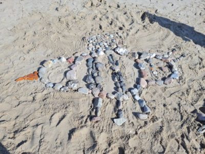 Auf dem riesigen Spielplatz tobten sich die Kinder aus und aßen ihr Räuberfrühstück in ihren Verstecken. Gemeinsam gingen wir am Strand spazieren und sammelten viele Steine für unsere Naturgruppe. Es kam die Idee auf, ein Landart in Form einer Biene aus den Steinen zu legen. Eifrig wurden große, kleine, dicke, dünne, helle und dunkle Steine gesammelt und verbaut. Karl und Piet (beide 5 Jahre) kümmerten sich um die Flügel, während Kalle (6 Jahre) und Mads (4 Jahre) besonders die schwarzen Steine für die dunkle Färbung suchten. Alle gemeinsam legten wir eine riesige Biene aus den Steinen.