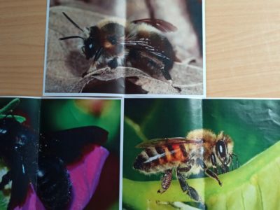 Danach sind wir nochmal auf die Farbgebung der Bienen eingegangen und wir zeigten den Kindern drei Bilder von verschiedenen Bienen: der Honigbiene, der Holzbiene und der Pelzbiene. Während die Honigbiene die klassische gelb-schwarze Färbung aufweist, sind die anderen beiden Arten deutlich dunkler gefärbt. Durch ein Ratespiel errieten die Kinder die Namen der Bienen und erzählten viele Infos, die sie bereits über die Bienen wussten (z.b. „die geben Honig!“) Henry (5 Jahre) und Piet (5 Jahre) errieten die Pelz und Holzbiene. Dementsprechend waren die beiden auch stolz wie Oskar (und haben auch allen Grund dazu!)