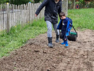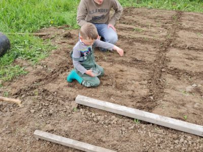 Da die Arbeit mit vielen Personen nicht möglich war, mussten wir auf die Hilfe von Maschinen zurückgreifen. Am Donnerstag, den 16.04.2021 war es dann soweit. Gemeinsam mit Henry, Karl, Mattis und Ute bin ich um 11 Uhr zu unserer Wiese gegangen. Mit lautem Knattern und Brummen kündigte er sich schon an. Diederich Diedrichsen oder auch kurz – Didi kam mit einem kleinen Traktor auf unsere Wiese gerollt. Hinter ihm ein kleiner Pflug gespannt, mit dem er die Erde bei uns mächtig aufwühlen wollte. Bei genauerer Betrachtung war uns die Fläche von 25 Quadratmetern doch ein bisschen zu „lütt“. Didi sagte so viel wie:“ Ich pflüg da zwei-dreimal drüber und dann ist das schon eine gute Fläche!“ Gesagt getan und so wurden unsere geplanten 25 Quadratmetern zu großzügigen 60 Quadratmetern. Anstelle von grüner Wiese ragten nun dicke braune Erdschichten aus dem Boden. Didi gab unseren Kindern auch eine Aufgabe: Die Kinder sollten alle Grassoden auf den Kopf drehen und festtreten. Eifrig machten sich die Kinder ans Werk und sammelten nebenbei noch ganz viele Regenwürmer für ihre Lupengläser. Jetzt ist die Erde noch sehr grob und dick. Am Freitag den 23.04.2021 kam uns Didi erneut besuchen und wühlte in unserem Beet herum, sodass dies nun bereit für die Aussaat ist.